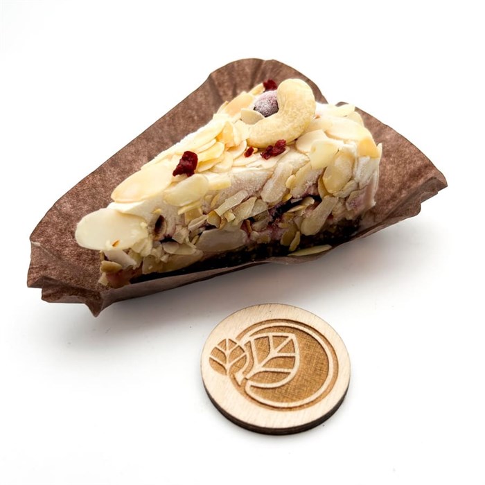 Состав: корж (фисташки, финики, мука зеленой гречки, кокосовая стружка), крем-чиз (ферментированный кешью, тофу, кокосовое молоко, сироп топинамбура, лимонный сок), ягодная начинка (вишня, сироп топинамбура, кокосовый сахар, агар-агар).