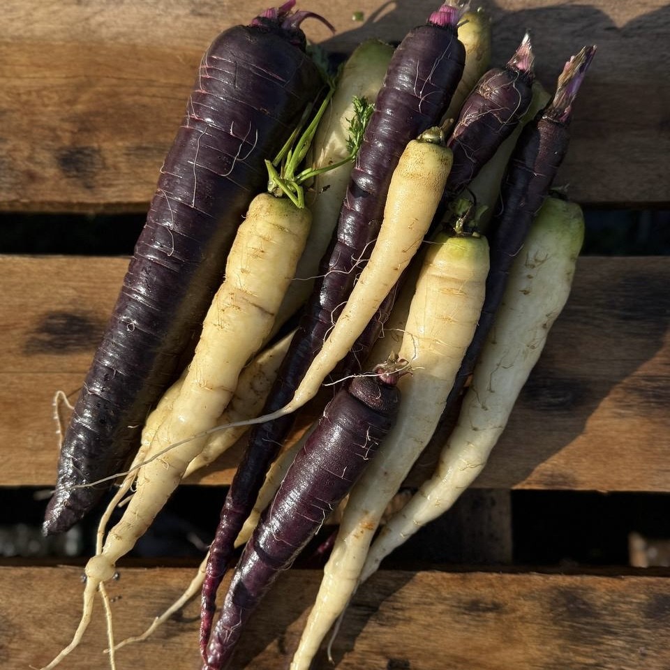 Именно фиолетовая (и желтая) морковь была первоначальной, дикой формой. Оранжевая выведена селекционерами в Голландии в XVII веке.