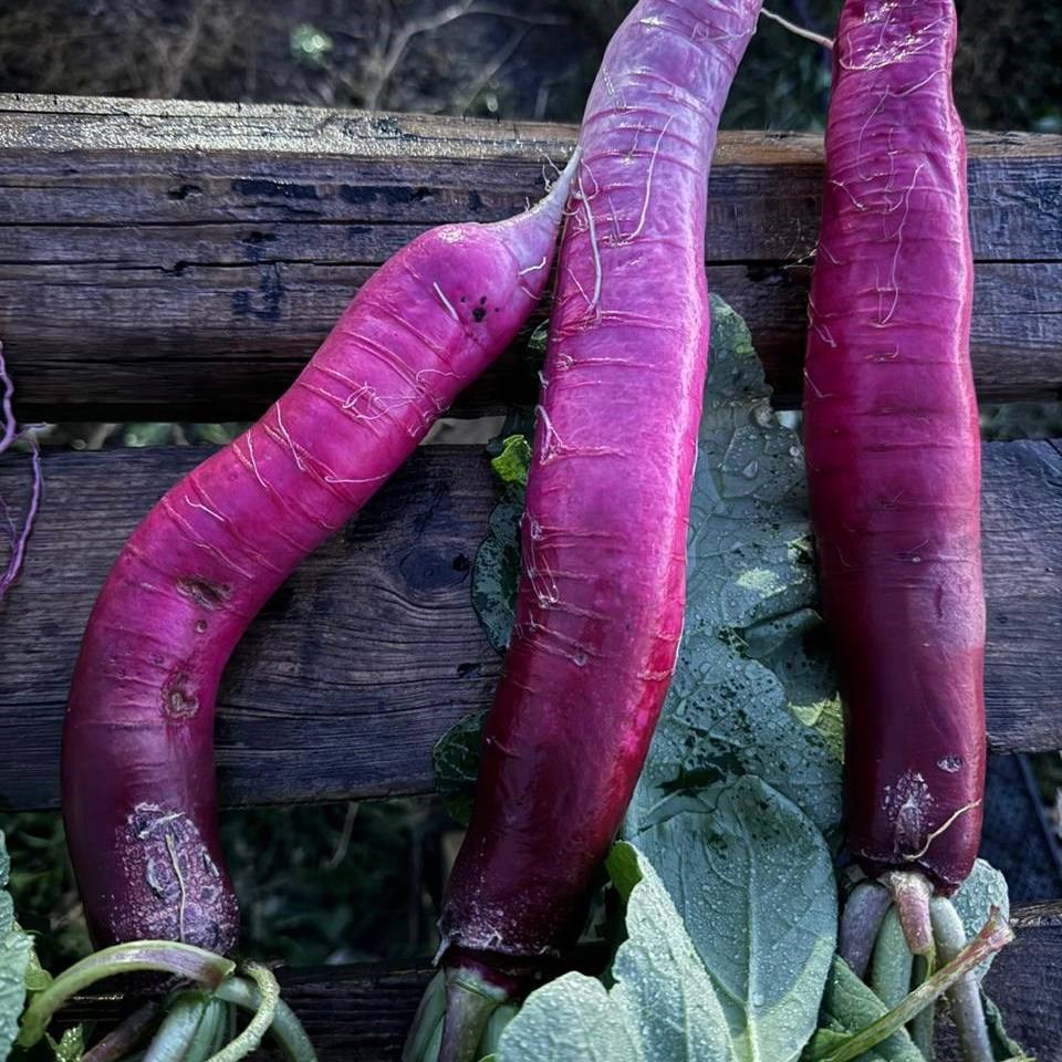 Редька сорта "Ладушка", выращенная на ферме "О,Батат" с использованием методов органического земледелия – корнеплод семейства капустные с яркой кожурой и нежной сочной мякотью белого цвета. Вкус остро-сладкий, поэтому её в первую очередь употребляют в свежем виде, добавляют в салаты, а также готовят: добавляют в супы и бульоны, запекают в духовке, тушат с мясом или другими овощами, обжаривают во фритюре до хрустящей корочки.