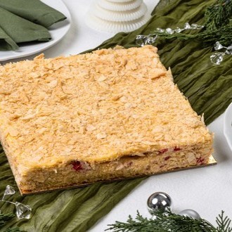 Хрустящее слоеное тесто с ванильным кремом и малиной. Ежегодно «Наполеон» входит в топ новогодних десертов. Блюдо полностью готово к употреблению. Выложить на тарелку и подать к столу.